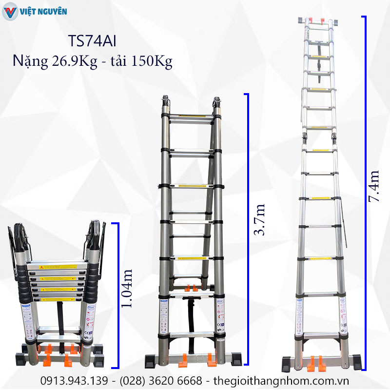 Dạng chữ A: 3.7m + 3.7m, đứng vững khi làm việc trong nhà hoặc khu vực hạn chế điểm tựa