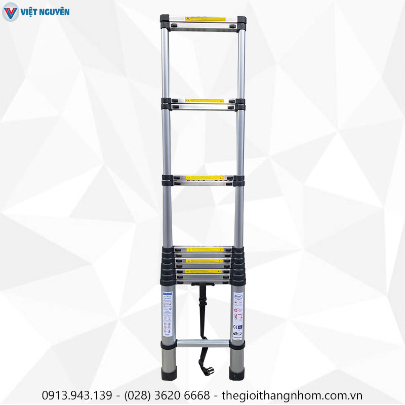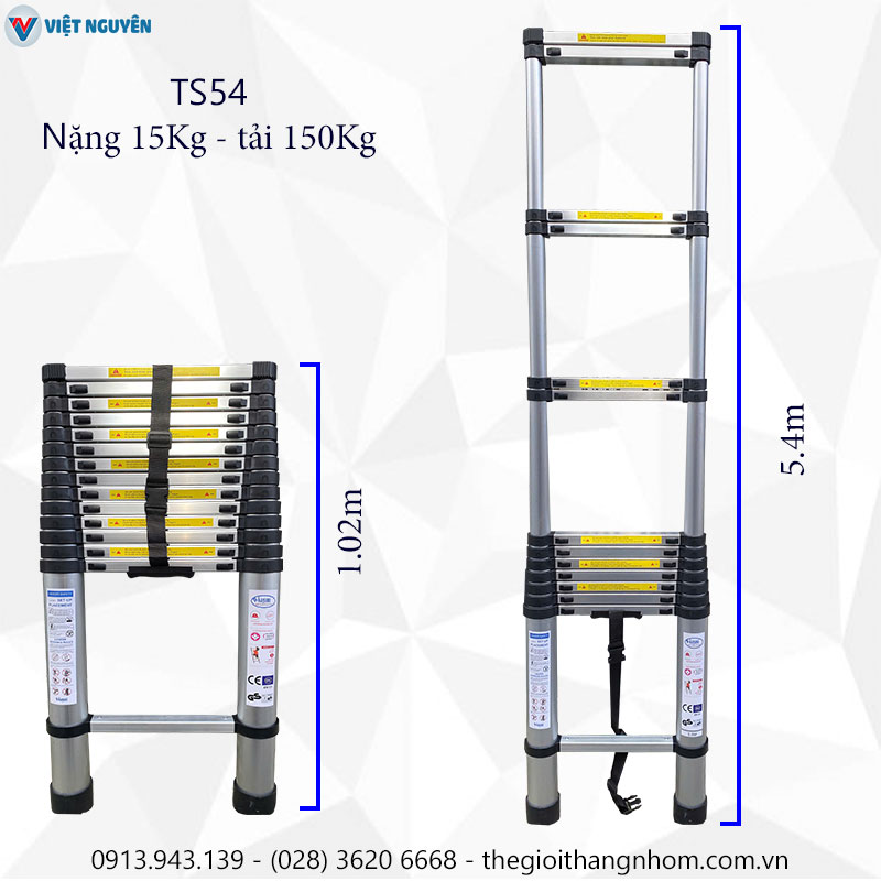 Thang có chiều cao tối đa 5.4m, khi rút gọn chỉ 102cm, cùng kích thước tổng thể 50 × 9.5 × 104 cm, giúp việc mang theo bằng xe máy hoặc để cốp ô tô trở nên cực kỳ dễ dàng.
